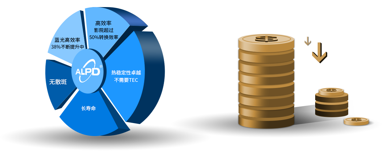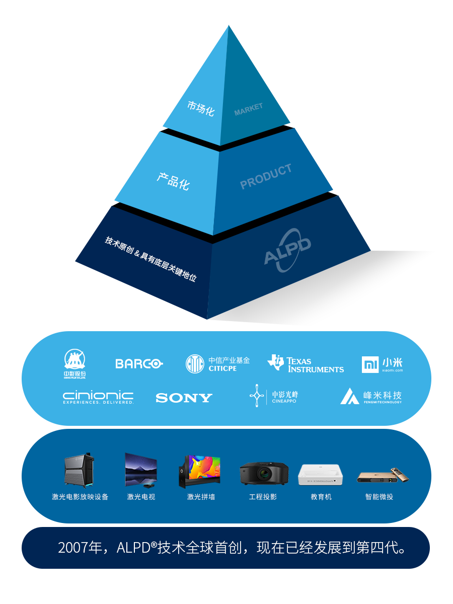 ALPD技術(shù)敏銳地察覺了激光技術(shù)結(jié)合稀土材料在高亮度投影光源上的可行性,創(chuàng)造性地提出了ALPD技術(shù)架構(gòu),實(shí)現(xiàn)了具有了低成本、高亮度、廣色域、無散斑等特點(diǎn)的激光光源,革命性地解決了激光顯示產(chǎn)業(yè)化遇到的困難,實(shí)現(xiàn)了激光技術(shù)的民用化,逐步應(yīng)用于顯示、照明等。