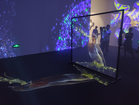 這場被稱為“新場景媒體嘗試”的展覽,力圖通過光影的創(chuàng)新呈現(xiàn),實現(xiàn)一種新的溝通方式,不僅是形式上的創(chuàng)新,更是展示維度上的重構(gòu)。在1500平米的空間里,置身在裸眼3D塑造的虛擬現(xiàn)實中,觀眾行走其間,用腳去丈量生命的維度。