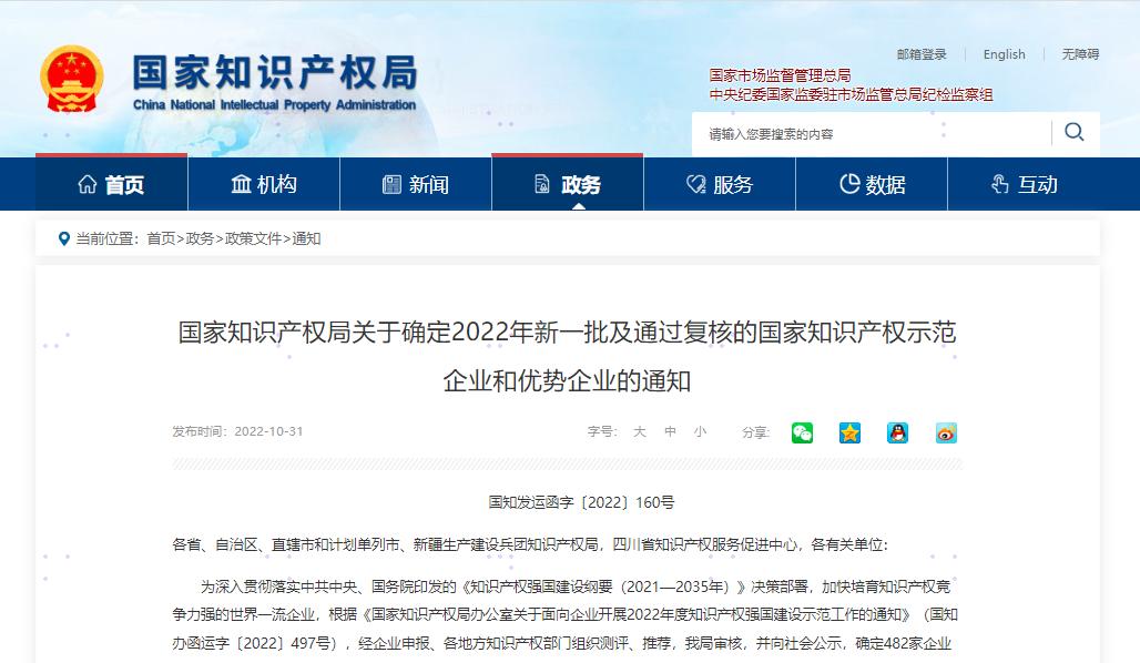 10月31日,國家知識產(chǎn)權(quán)局官網(wǎng)正式發(fā)布《關(guān)于確定2022年新一批及通過復(fù)核的國家知識產(chǎn)權(quán)示范企業(yè)和優(yōu)勢企業(yè)的通知》。