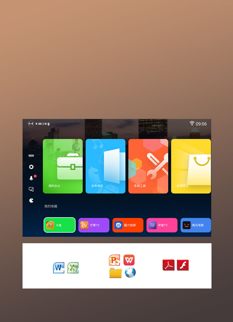 支持小明助手、miracast、airplay同屏推送功能,